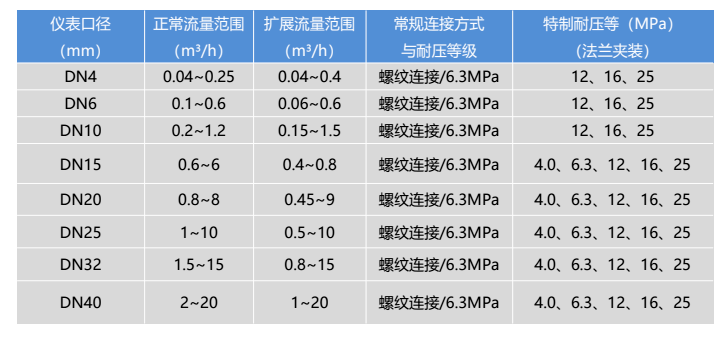 | 儀表口徑(mm) 及連接方式 | 4、6、10、15、20、32、40采用螺紋連接 |